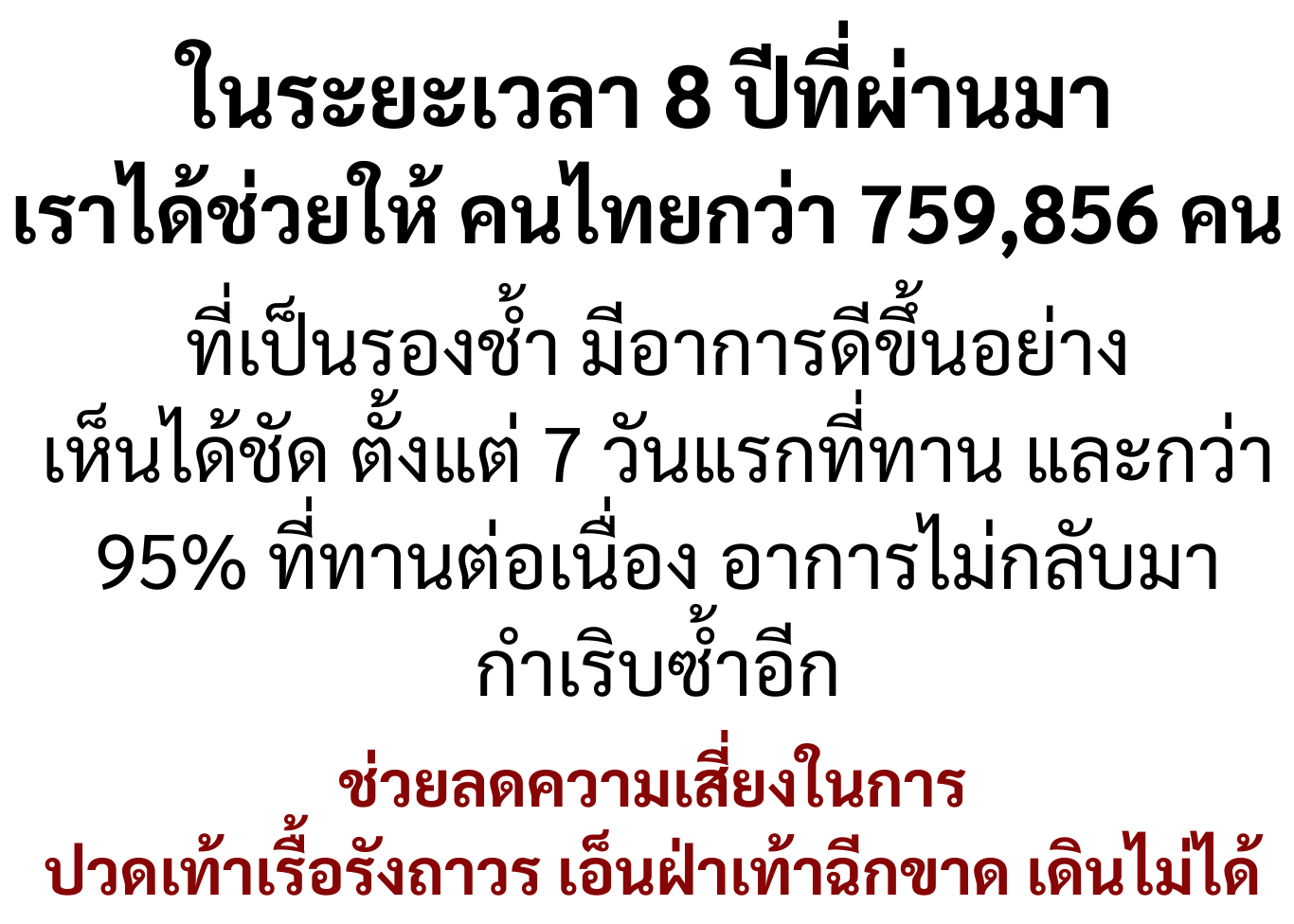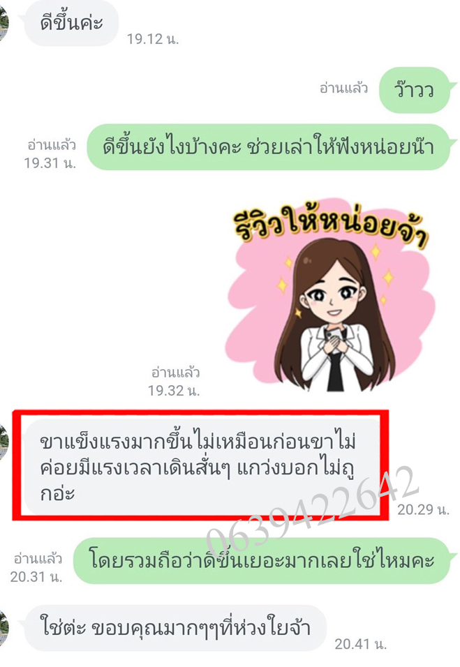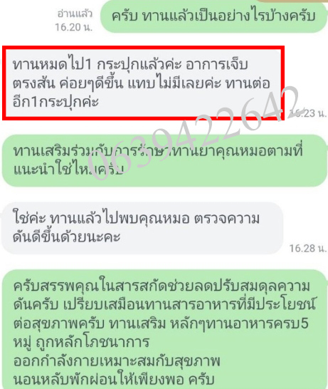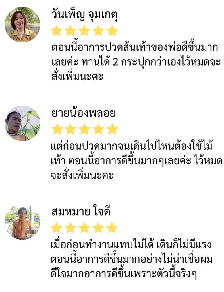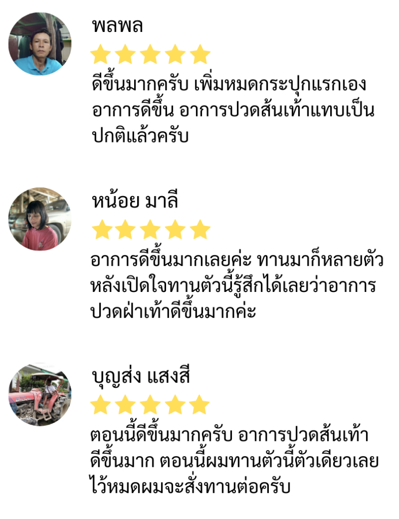 จนตอนนี้หมอไม่ได้ให้ยาแล้ว ป้ารู้สึกโชคดีมากที่เจอพี่ปา และยาตัวนี้ที่ทำให้ป้าหายจากรองช้ำ โดยไม่ต้องกินยาเป็นกำๆ ให้ตับ ไต พัง ต้องขอบคุณพี่ปาแกจริงๆ ทุกวันนี้ก็ไปมาหาสู่ เป็นผู้มีพระคุณคนหนึ่งในชีวิต รู้สึกว่าหลุดพ้นจากโรคเวรโรคกรรมนี้สักที