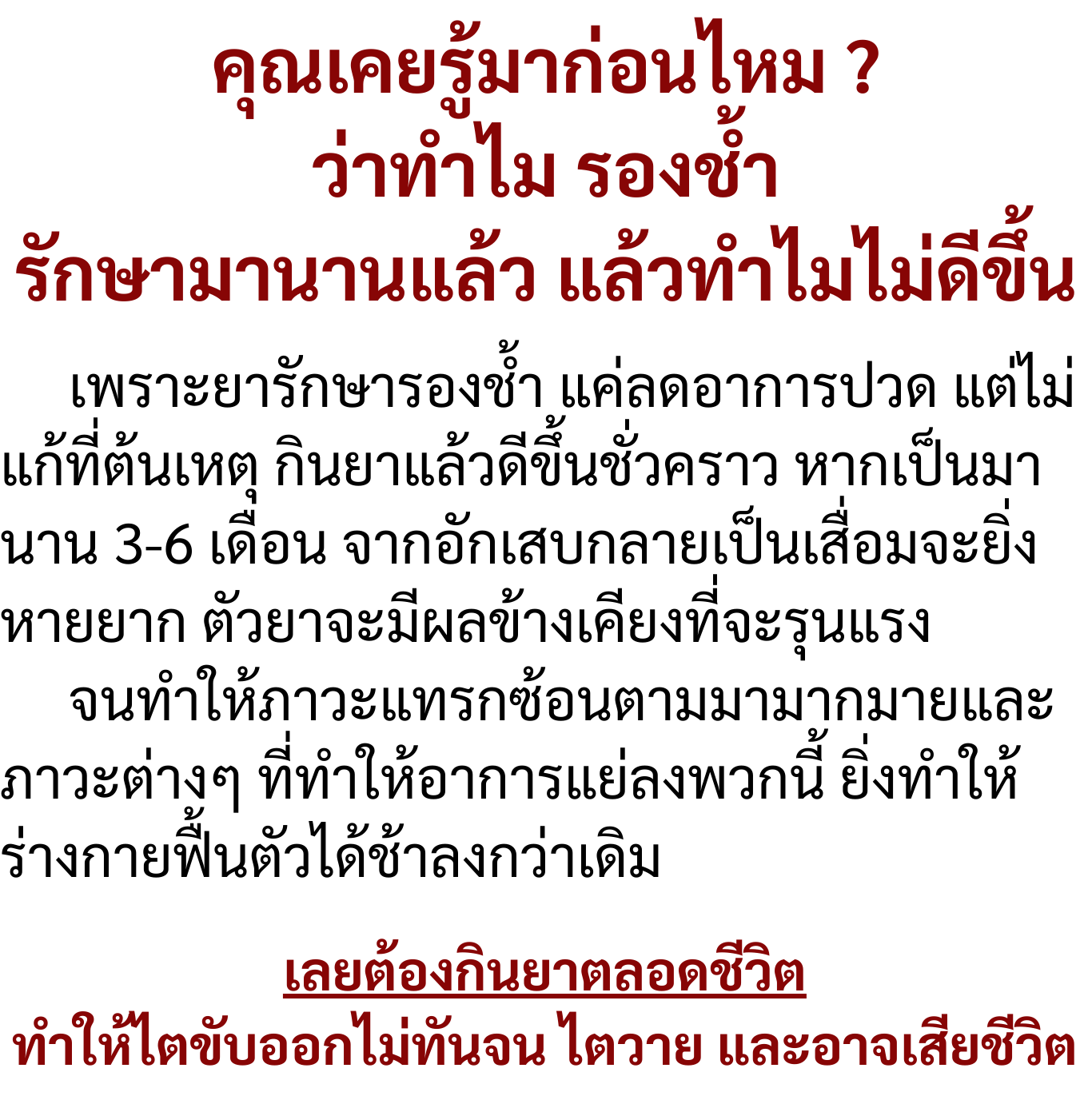 คนที่กำลังเป็นรองช้ำมานานๆ รักษามาหลายวิธีหรือตอนนี้ทานยาเป็นกำๆอยู่ แต่กลัวผลข้างเคียงเป็นไตวาย ป้าอยากให้ลอง BLB P ดู ไหนๆก็ลองมาหลายอย่างแล้ว ป้ากินแล้วก็ดีขึ้น จึงกล้ามาบอก แฟนป้าก็ให้กินแข็งแรงขึ้นเยอะ