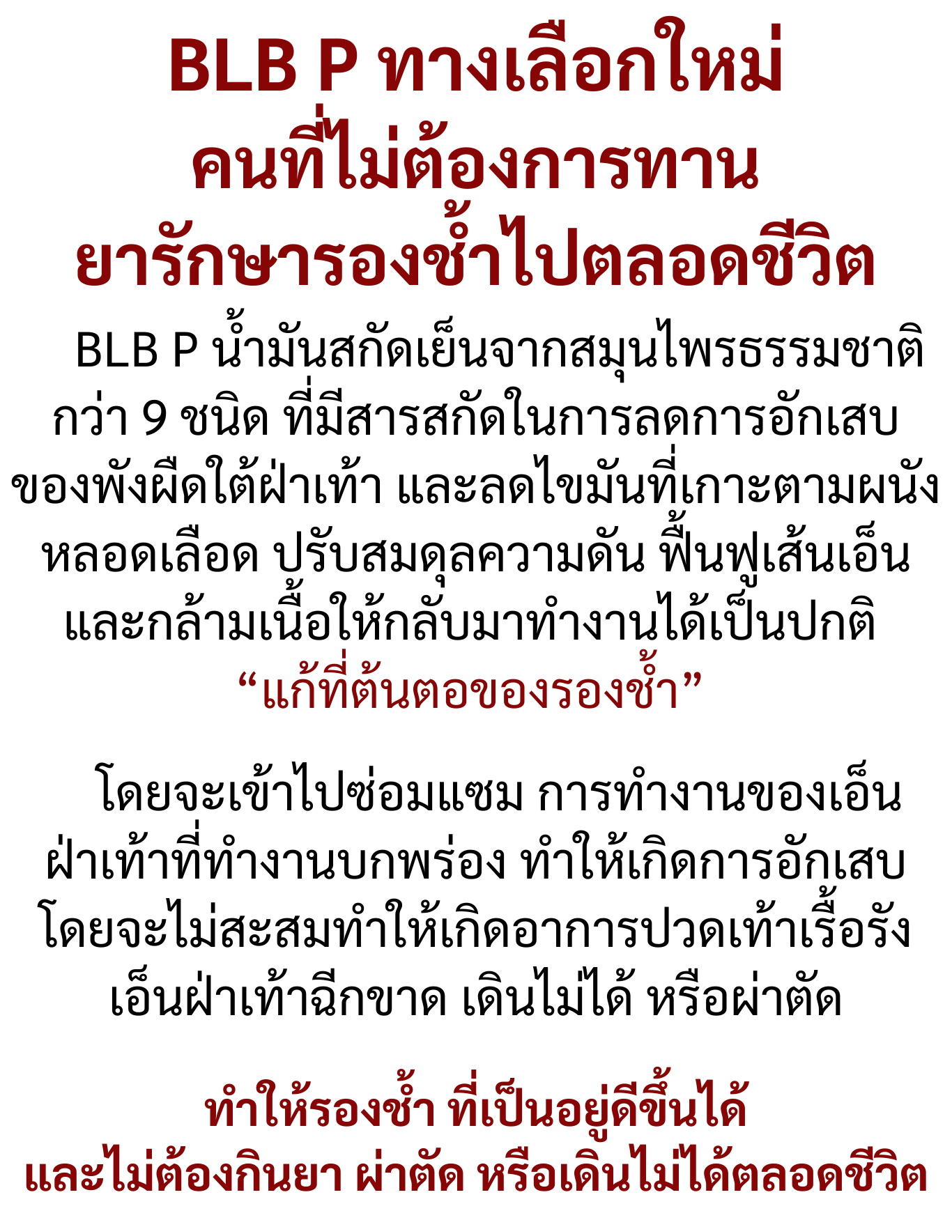 กว่าเราจะ BLB P ออกสู่ตลาดไปยังผู้บริโภค เราได้ให้นักวิจัยคิดค้นสูตรกว่า 3 ปี เพื่อได้สิ่งที่เข้มข้น เห็นผลเร็วที่สุด เพราะเรารู้ว่าคนที่เป็นรองช้ำ มันทรมานกับการใช้ชีวิตประจำวันมากแค่ไหน