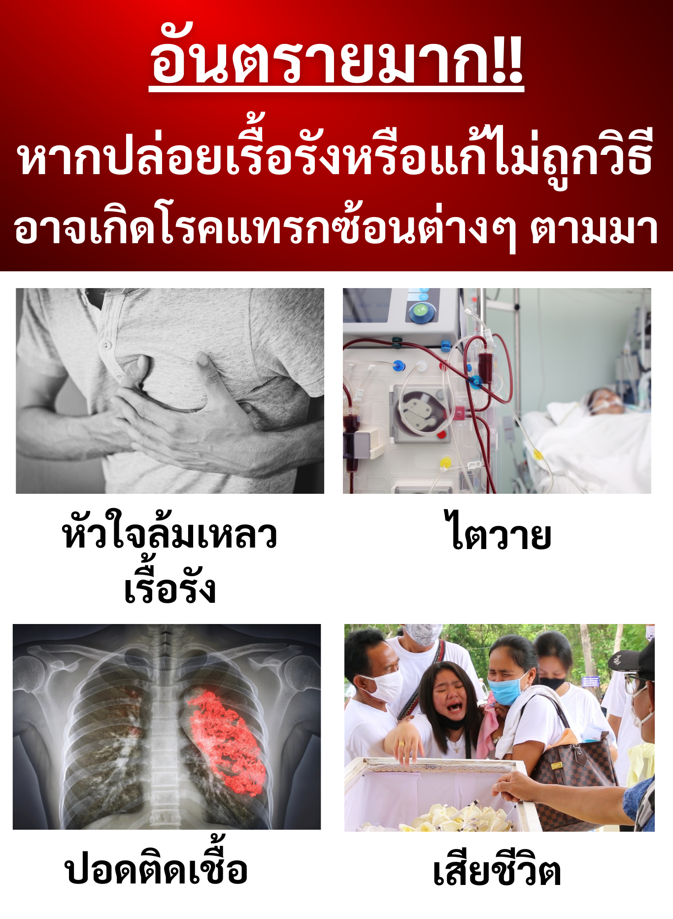 ป้าอาการเริ่มหนักขึ้น ลูกสาวเลยพาไปหาหมอ ถึงรู้ว่าเป็นน้ำท่วมปอด หมอบอกหากปล่อยไว้นานไม่รีบรักษา มีโอกาสทำให้หัวใจล้มเหลวเรื้อรัง ปอดติดเชื้อ ปอดบวม ไตวาย ร้ายแรงถึงขั้นเสียชีวิตได้เลย ป้าต้องรักษากินยามาตลอด ตายไม่เท่าไหร่ กลัวเป็นภาระของลูกสาวนี้สิ