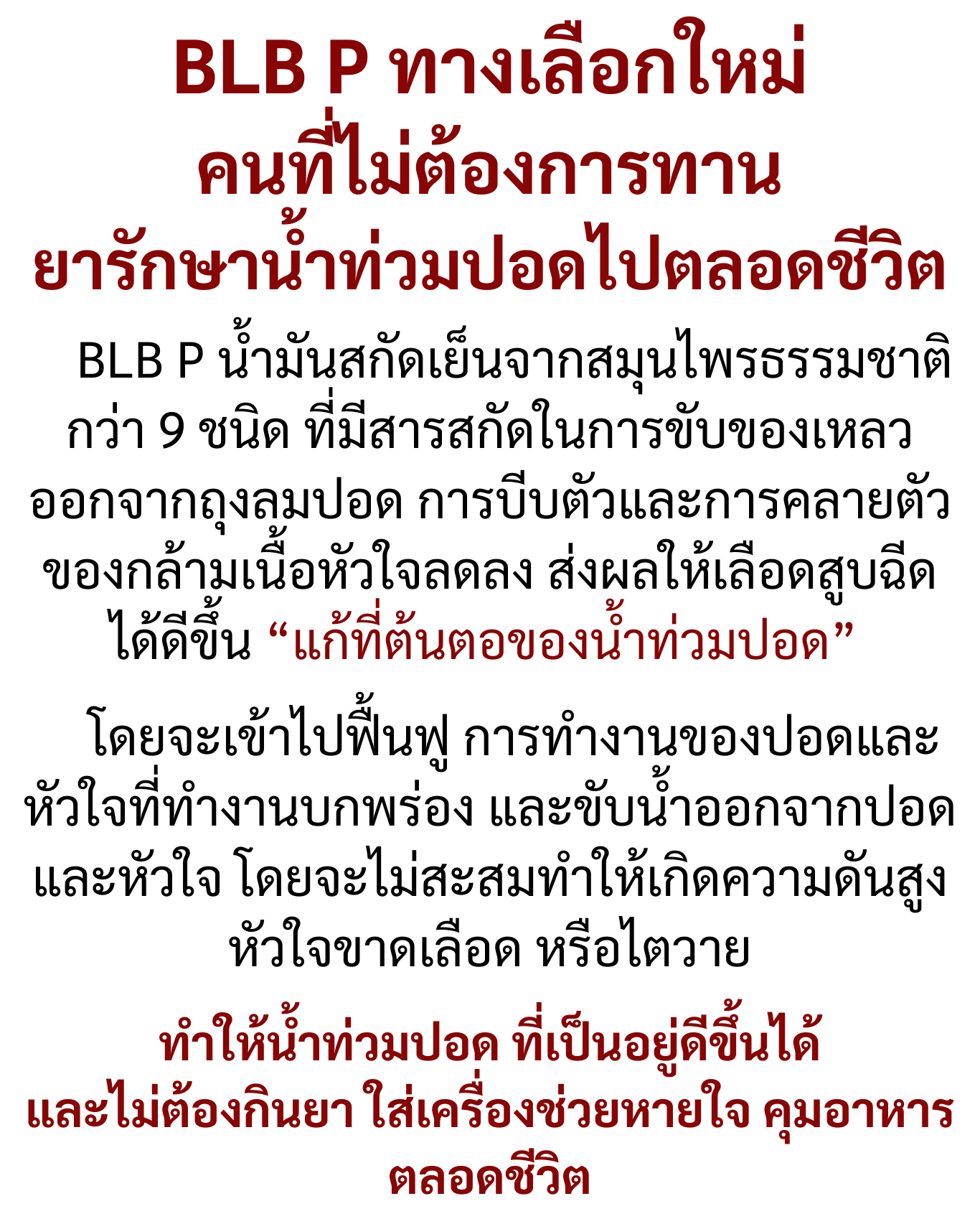 คนที่กำลังเป็นน้ำท่วมปอดมานานๆ รักษามาหลายวิธีหรือตอนนี้ทานยาเป็นกำๆอยู่ แต่กลัวผลข้างเคียงเป็นไตวาย ป้าอยากให้ลอง BLB P ดู ไหนๆก็ลองมาหลายอย่างแล้ว ป้ากินแล้วก็ดีขึ้น จึงกล้ามาบอก แฟนป้าก็ให้กินแข็งแรงขึ้นเยอะ