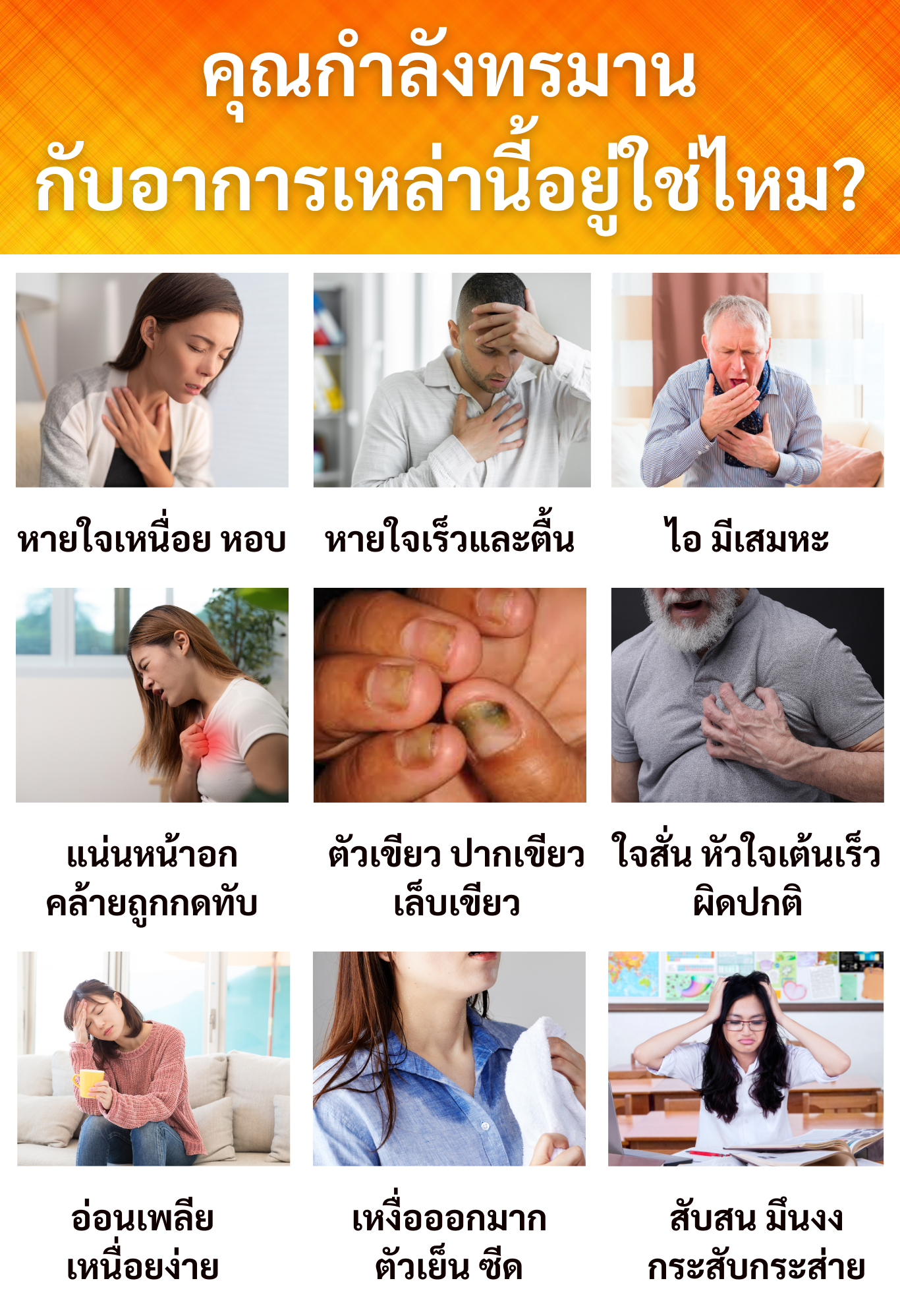 สวัสดีค่ะ ชื่อ ป้าพร นะคะ อายุ 63 ปี เป็นคนลำพูนค่ะ ป้าเคยเป็นน้ำท่วมปอดมานานกว่า 3 ปีค่ะ แต่ตอนนี้หายเป็นปกติแล้ว ป้ามีอาการหายใจเหนื่อย หอบ หายใจเร็ว ตื้น แน่นหน้าอกคล้ายโดนทับ บางครั้งก็หัวใจเต้นเร็ว ใจสั่น อ่อนเพลีย เหนื่อยง่าย เหงื่อออกเยอะมาก ซื้อยามาทานก็ไม่ดีขึ้น