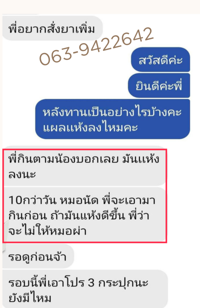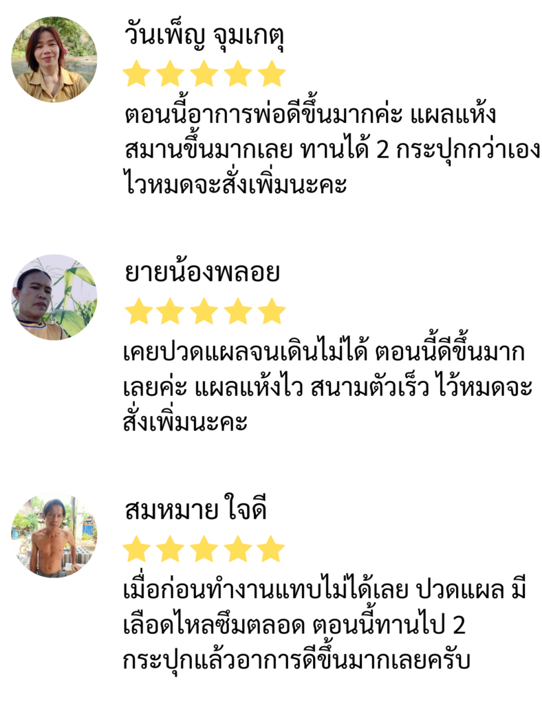 หลังจากที่ได้ของมา ป้าก็กินหลังอาหารเช้า 1 เม็ด หลังอาหารเย็น 1 เม็ด ตามที่ผู้เชี่ยวชาญเขาแนะนำ สัปดาห์แรกป้าว่า อาการแผลเริ่มดีขึ้น ไม่บวมเหมือนแต่ก่อน ป้าเลยกินต่อประมาณ 15 วัน รู้สึกแผลแห้งเร็ว สมานตัวดีขึ้น