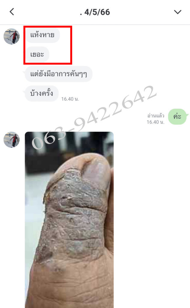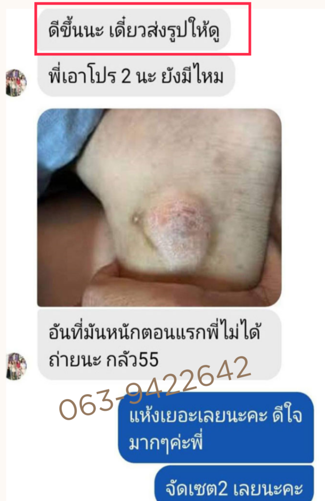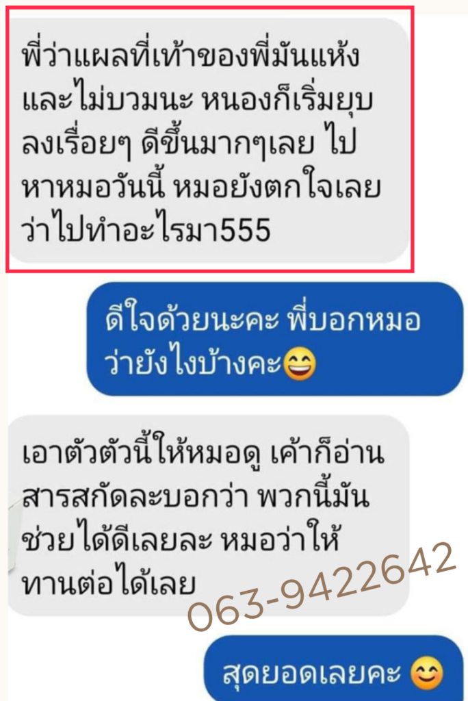 จนตอนนี้หมอไม่ได้ให้ยาแล้ว ป้ารู้สึกโชคดีมากที่เจอพี่ปา และยาตัวนี้ที่ทำให้ป้าหายจากแผลเบาหวาน โดยไม่ต้องกินยาเป็นกำๆ ไม่ต้องล้างแผลทุกวัน ขอบคุณพี่ปาแกจริงๆ ทุกวันนี้ก็ไปมาหาสู่ เป็นผู้มีพระคุณคนหนึ่งในชีวิต รู้สึกว่าหลุดพ้นจากโรคเวรโรคกรรมนี้สักที