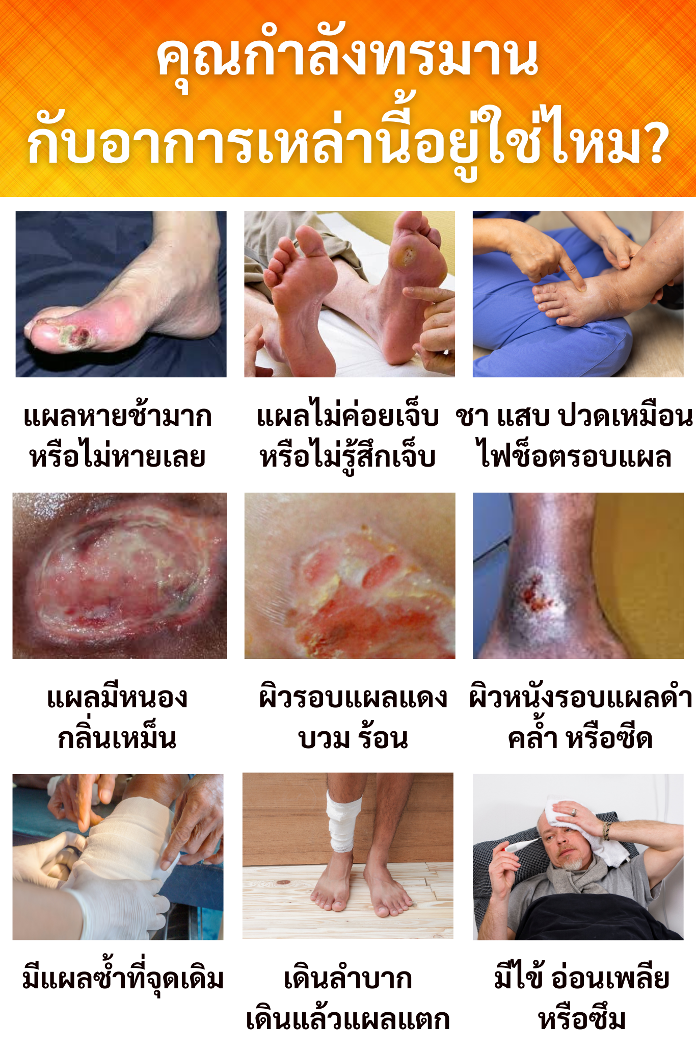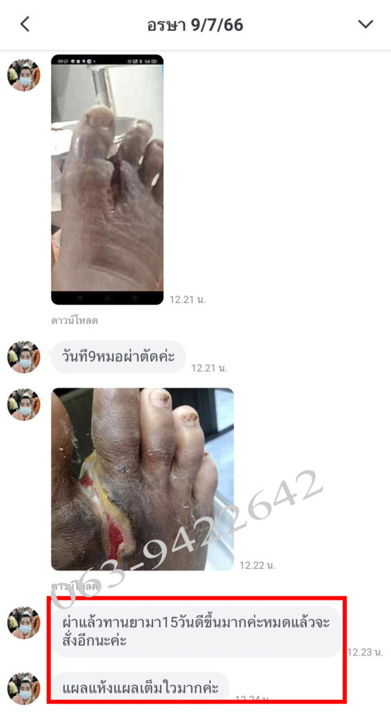 สวัสดีค่ะ ชื่อ ป้าพร นะคะ อายุ 63 ปี เป็นคนลำพูนค่ะ ป้าเคยเป็นแผลเบาหวานมานานกว่า 3 ปีค่ะ แต่ตอนนี้หายเป็นปกติแล้ว ป้ามีอาการเบาหวานมา 20 กว่าปี ประมาณปีที่แล้วป้าเผลอไปเหยียบตะปูมีแผลเพียงเล็กน้อย แต่แผลก็ไม่หายสักที แผลลุกลามเร็วมาก เน่ามีกลิ่นเหม็น เปื่อยและมีเลือดซึมตลอด ซื้อยามาทานก็ไม่ดีขึ้น