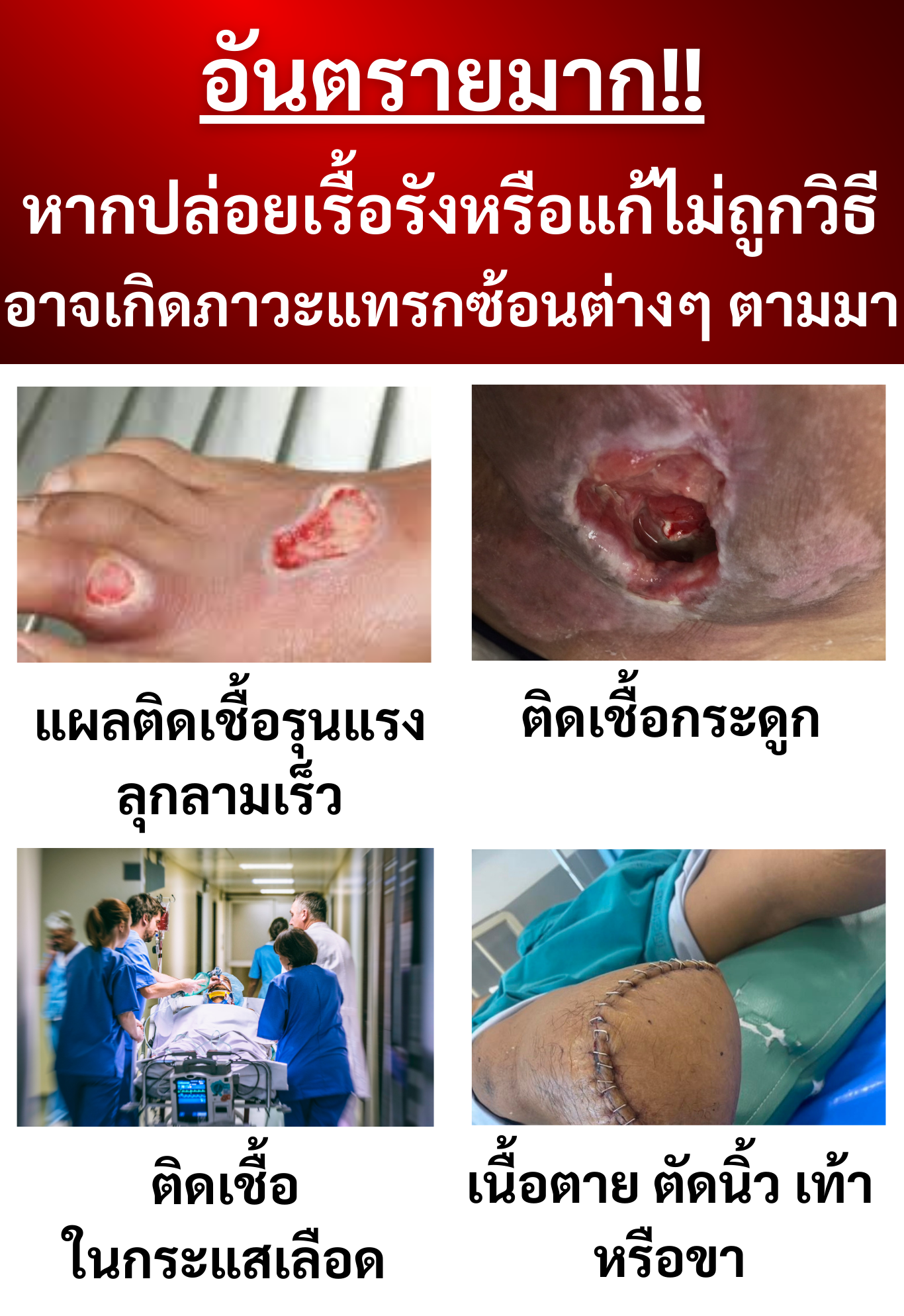 ป้าอาการเริ่มหนักขึ้น ลูกสาวเลยพาไปหาหมอ หมอบอกหากปล่อยไว้นานไม่รีบรักษา มีโอกาสทำให้แผลติดเชื้อรุนแรง ติดเชื้อในกระดูก ติดเชื้อในกระแสเลือด ร้ายแรงถึงขั้นเนื้อตาย ต้องตัดขาทิ้งเลย ป้าต้องรักษากินยามาตลอด ตายไม่เท่าไหร่ กลัวเป็นภาระของลูกสาวนี้สิ