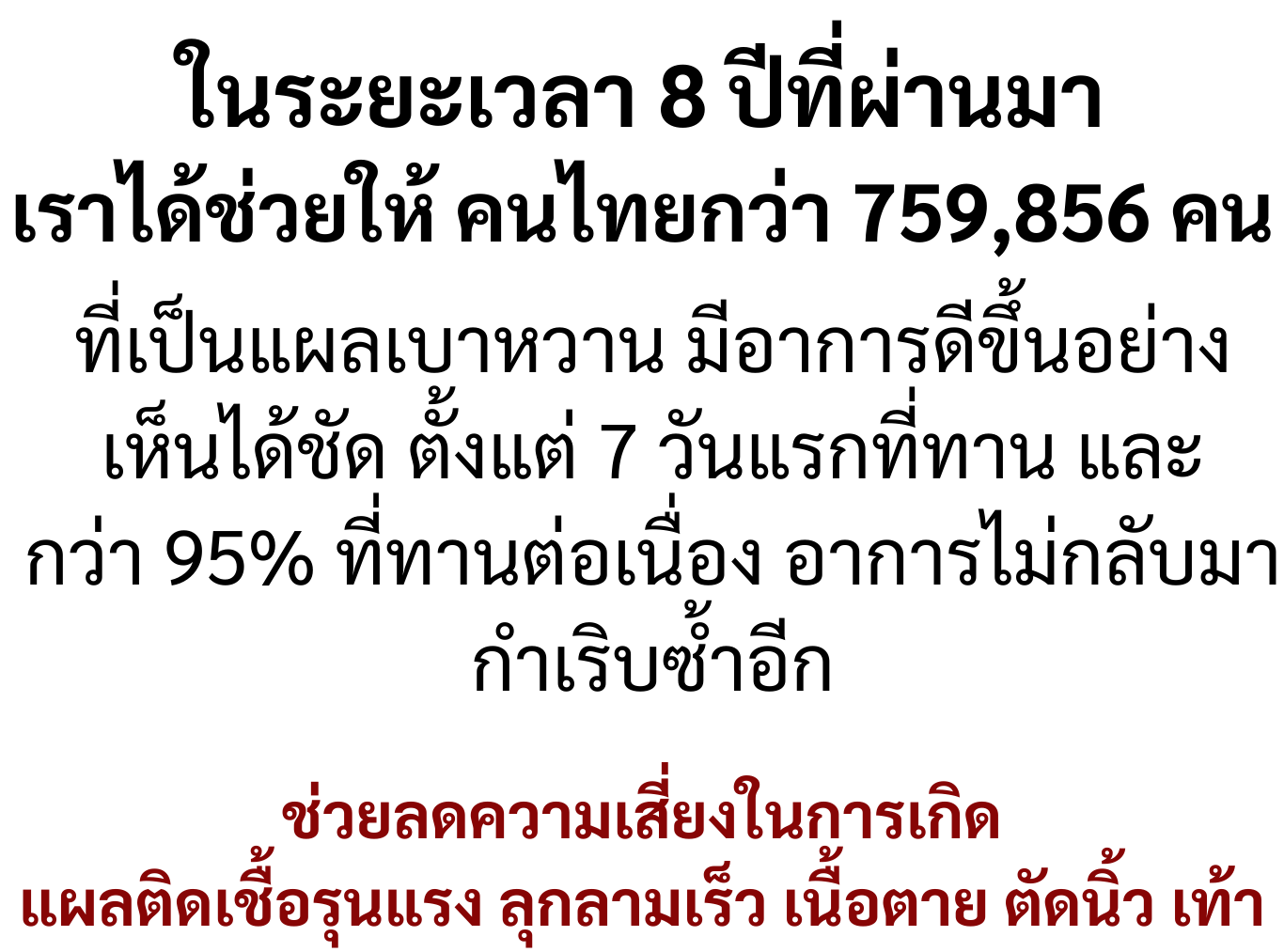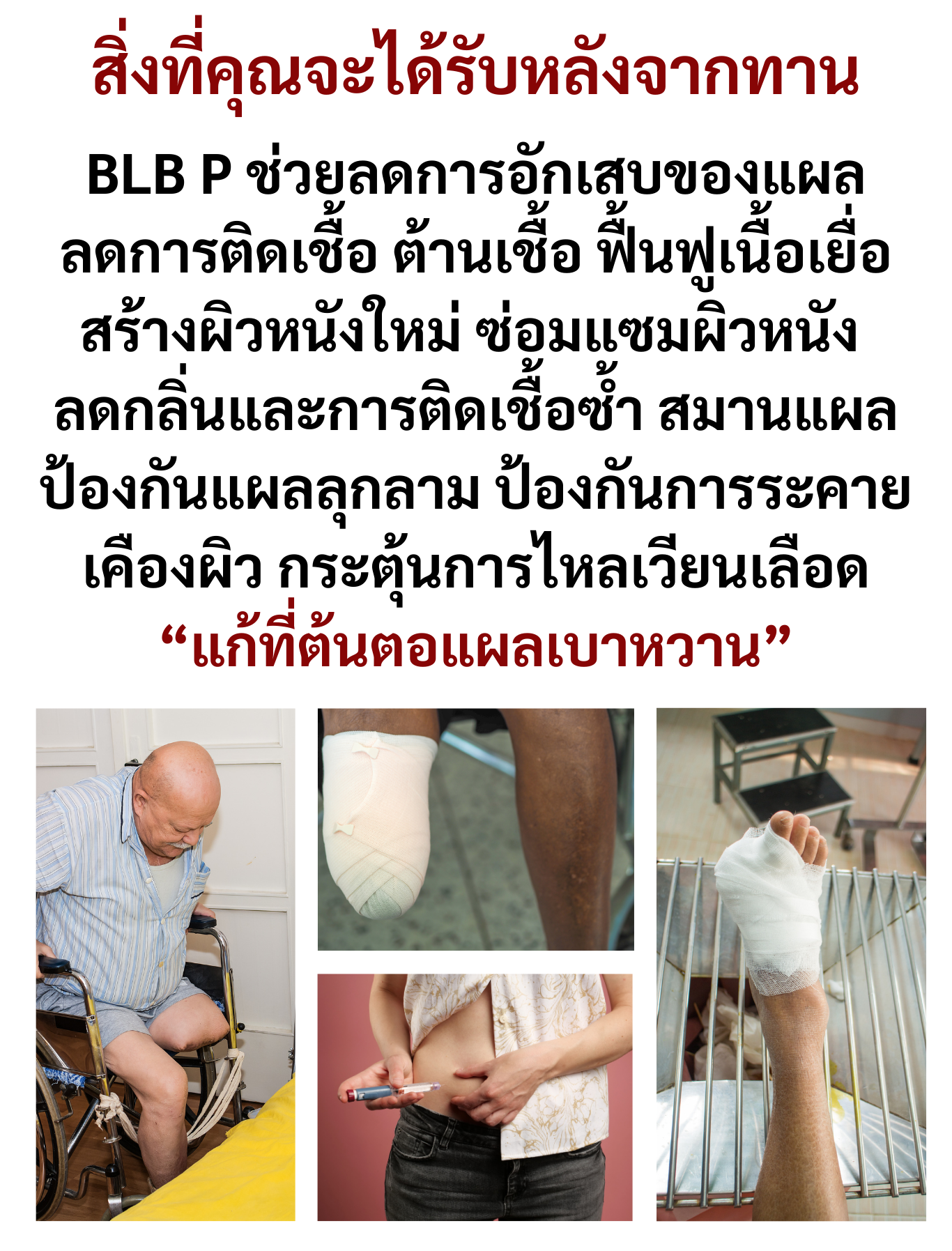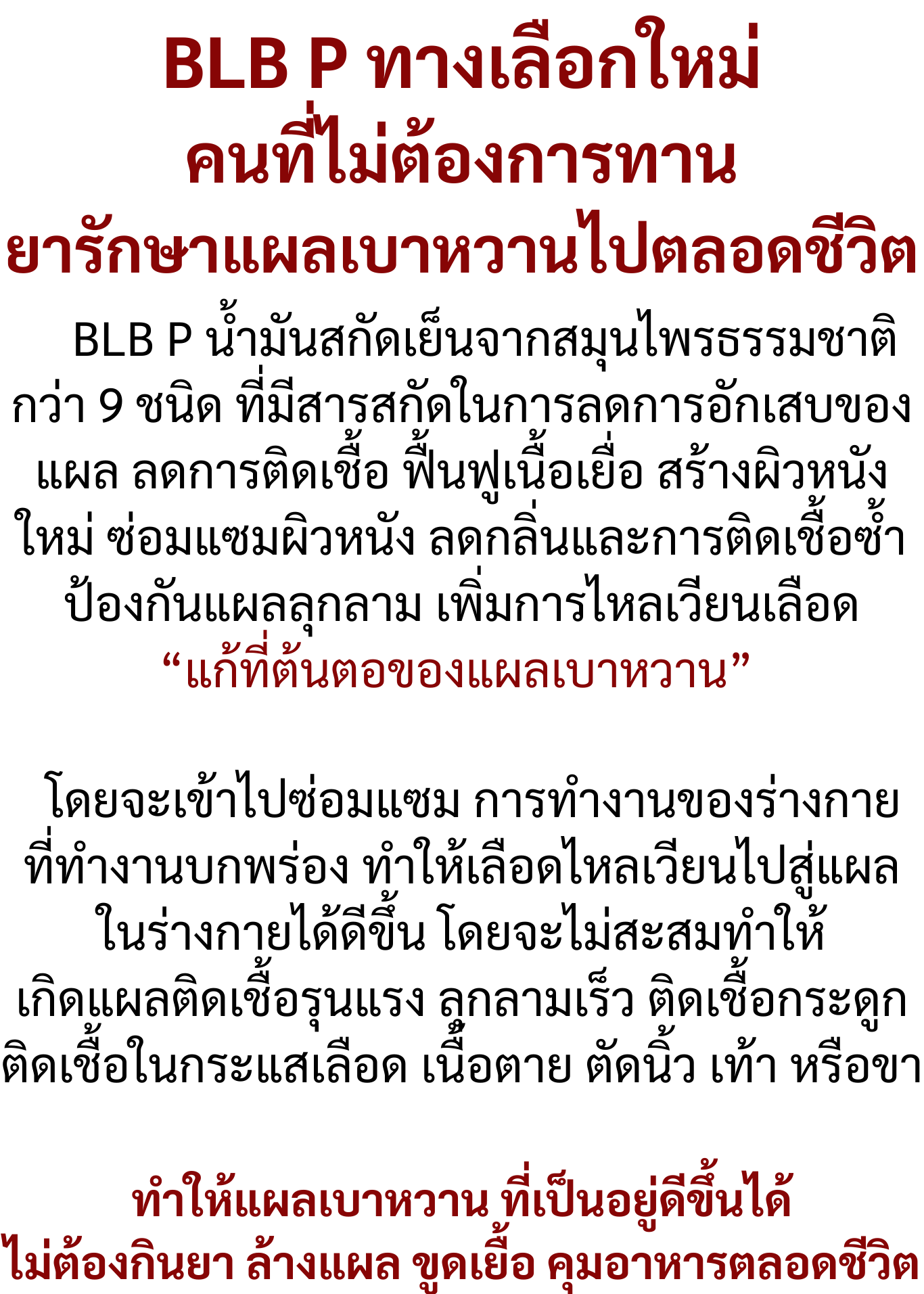 คนที่กำลังเป็นแผลเบาหวานมานานๆ รักษามาหลายวิธีหรือตอนนี้ทานยาเป็นกำๆอยู่ แต่กลัวผลข้างเคียงเป็นไตวาย ป้าอยากให้ลอง BLB P ดู ไหนๆก็ลองมาหลายอย่างแล้ว ป้ากินแล้วก็ดีขึ้น จึงกล้ามาบอก แฟนป้าก็ให้กินแข็งแรงขึ้นเยอะ