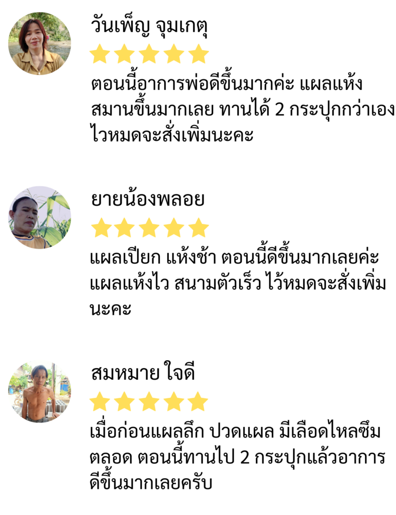 พอคุณแม่ทานไป 14 วันแรก แผลเริ่มตื้นขึ้นเป็นสีดำและรูโพงของแผลก็ฟูขึ้นมาจนปิด ไม่ต้องยัดสำลีชุบน้ำแล้ว จากตอนแรกที่เป็นแผลกดทับทั่วทั้งบริเวณก้นกบตอนนี้แผลเหลือประมาณ 3 นิ้ว และแผลที่หลังที่มีนิดเดียวก็ปิดสนิทหายหมดแล้ว