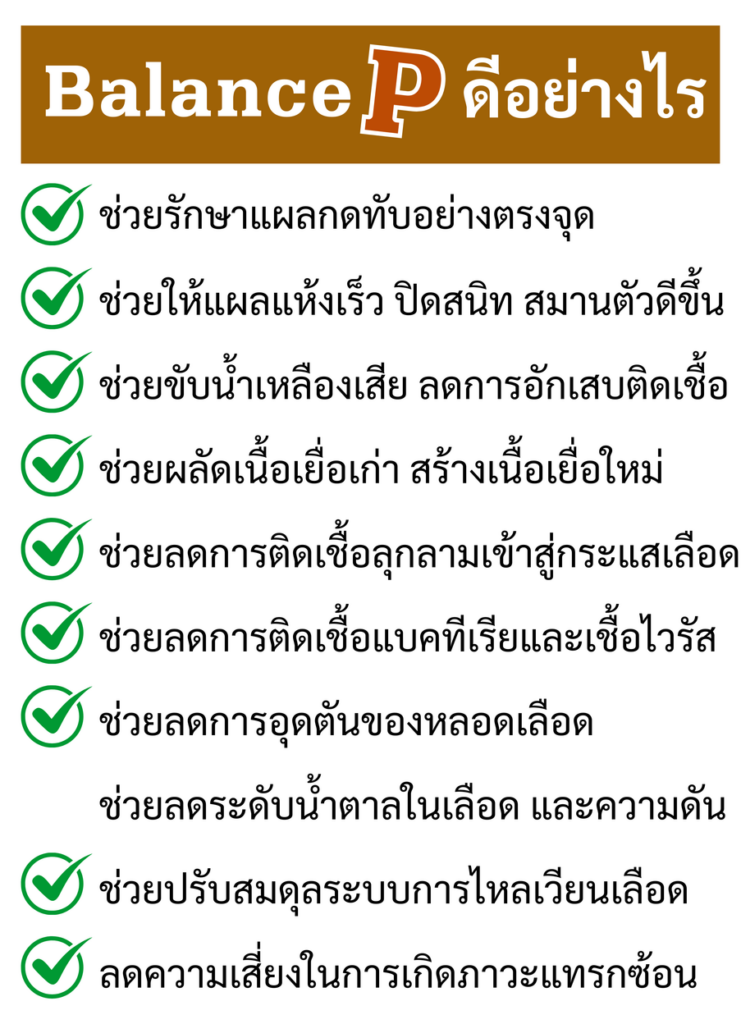 Balance P เป็นน้ำมันสกัดจากสมุนไพรแท้ 9 ชนิด ที่ออกฤทธิ์ได้ไวและดูดซึมเร็วกว่ายาทั่วไปถึง 3 เท่า ช่วยลดน้ำตาลในเลือดและลดไขมันที่อุดตันตามผนังหลอดเลือดทำให้เลือดไหลเวียนได้ดีขึ้นพร้อมฟื้นฟูเส้นประสาทและลดการติดเชื้อ การอักเสบ เป็นการแก้อาการแผลกดทับอย่างตรงจุด