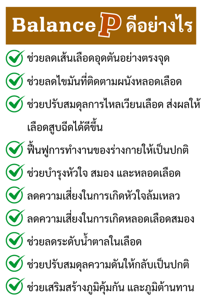 Balance P เป็นน้ำมันสกัดจากสมุนไพรแท้ 9 ชนิด ที่ออกฤทธิ์ได้ไวและดูดซึมเร็วกว่ายาทั่วไปถึง 3 เท่า ช่วยลดไขมันที่อุดตันตามผนังหลอดเลือดทำให้เลือดไหลเวียนได้ดีขึ้นพร้อมฟื้นฟูระบบการทำงานของร่างกายให้กลับมาทำงานเป็นปกติ เป็นการแก้อาการเส้นเลือดอุดตันอย่างตรงจุด