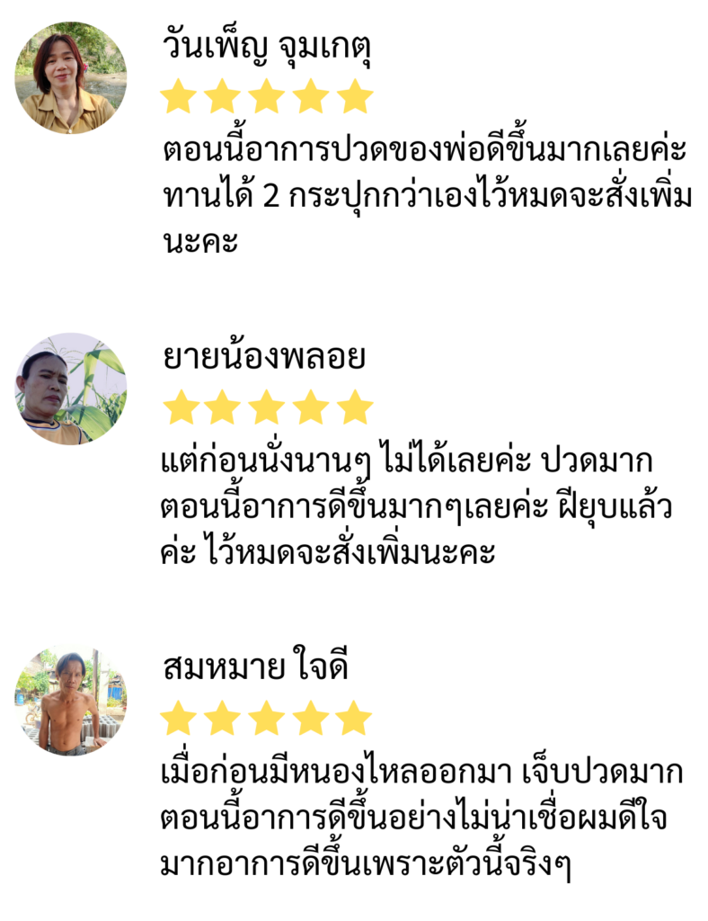 ผลลัพธ์หลังจากทานได้ 5 วัน คืออาการกลับดีขึ้นเฉย รู้สึกไม่ค่อยมีอาการปวดบ่อยเหมือนแต่ก่อน พรจึงตั้งใจทานต่อเนื่องจนหมด แทบไม่น่าเชื่อ! อาการฝีคัณฑสูตรที่เป็น ๆ หาย ๆ มานาน ไม่กลับมากวนใจพรอีกเลย พรดีใจมาก ๆ