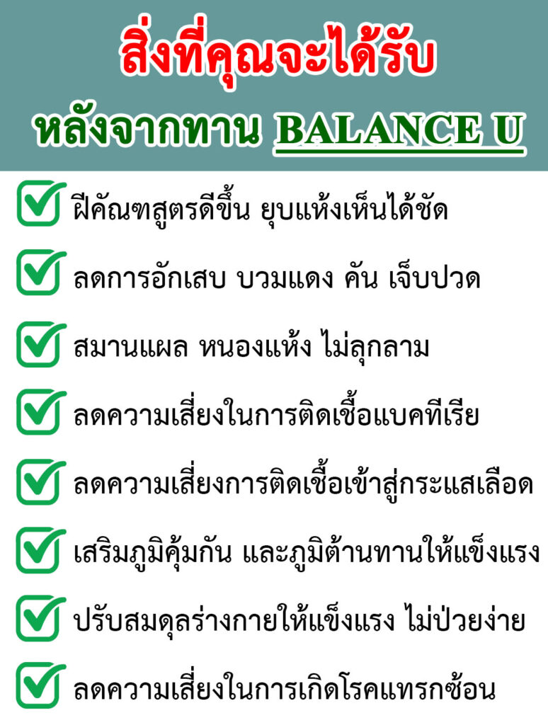 Balance U Core เป็นน้ำมันสกัดจากสมุนไพรแท้ 13 ชนิด ที่ออกฤทธิ์ได้ไวและดูดซึมเร็วกว่ายาทั่วไปถึง 3 เท่า ช่วยลดการอักเสบ ปวด บวม บริเวณบริเวณทวารหนัก พร้อมยับยั้งการลุกลามการเจริญเติบโตของเชื้อโรคต่าง ๆ พร้อมเสริมภูมิคุ้มกันและภูมิต้านทานต่อสิ่งกระตุ้น เป็นการแก้อาการฝีคัณฑสูตรอย่างตรงจุด