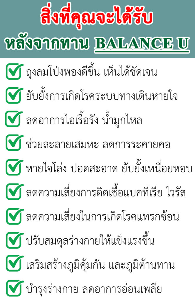 Balance U Core เป็นน้ำมันสกัดจากสมุนไพรแท้ 13 ชนิด ที่ออกฤทธิ์ได้ไวและดูดซึมเร็วกว่ายาทั่วไปถึง 3 เท่า ช่วยฟื้นฟูรักษาถุงลมในปอดที่ทำให้ปอดถูกทำลายและลดการติดเชื้อในปอด พร้อมเสริมภูมิคุ้มกันและภูมิต้านทานต่อสิ่งกระตุ้น เป็นการแก้อาการถุงลมโป่งพองอย่างตรงจุด