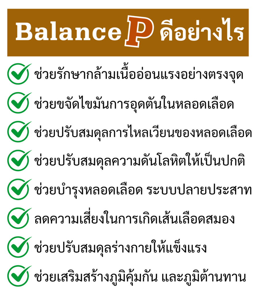 Balance P เป็นน้ำมันสกัดจากสมุนไพรแท้ 9 ชนิด ที่ออกฤทธิ์ได้ไวและดูดซึมเร็วกว่ายาทั่วไปถึง 3 เท่า ช่วยลดไขมันที่อุดตันตามผนังหลอดเลือดทำให้เลือดไหลเวียนไปสู่ระบบประสาทที่ควบคุมการเคลื่อนไหวได้ดีขึ้นพร้อมฟื้นฟูระบบการทำงานของประสาท เป็นวิธีแก้อาการกล้ามเนื้ออ่อนแรงอย่างตรงจุด