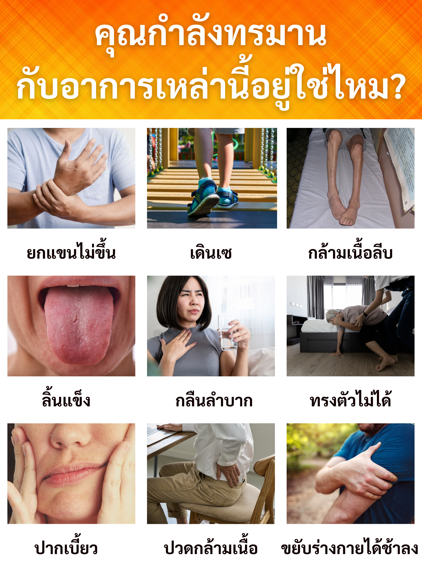 เพื่อน ๆ พี่ ๆ กำลังมีอาการเหล่านี้อยู่ใช่ไหม มือ เท้า แขน ขา อ่อนแรง กล้ามเนื้อแขนขาลีบ เดินเองไม่ค่อยได้ พูดและกลืนลำบาก พูดไม่ชัด พูดเหมือนลิ้นแข็ง กล้ามเนื้อเปลือกตาตก เหนื่อยง่าย เป็นต้น ถ้ากำลังมีอาการเหล่านี้อยู่ ลองอ่านเรื่องราวของพรดูนะคะ